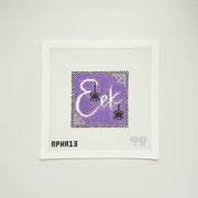 This stitch painted needlepoint canvas features the word "Eek!" in bold white lettering on a vibrant purple background, accented with a classic black-and-white checkered border.