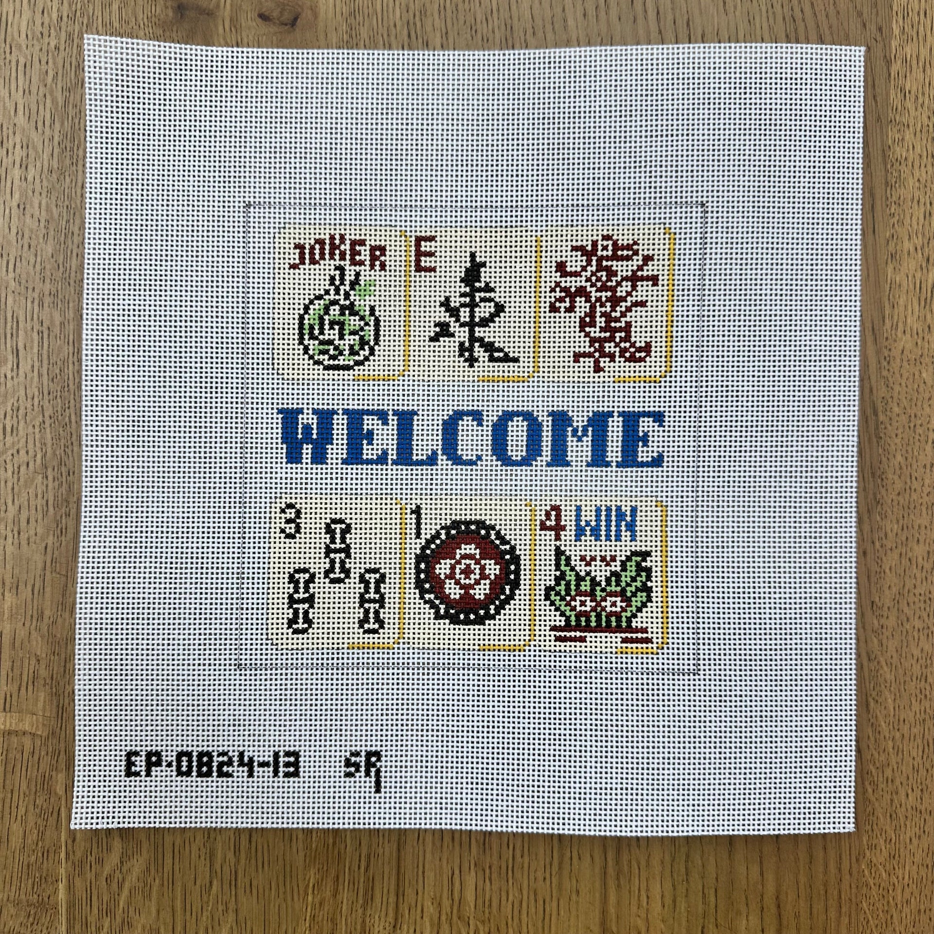 EP0824-13 Mahjong, 'Welcome' - 13 Mesh - TS, 13 mesh, Handpainted by Susan Roberts, Design Size: 6.75 x 6.75"