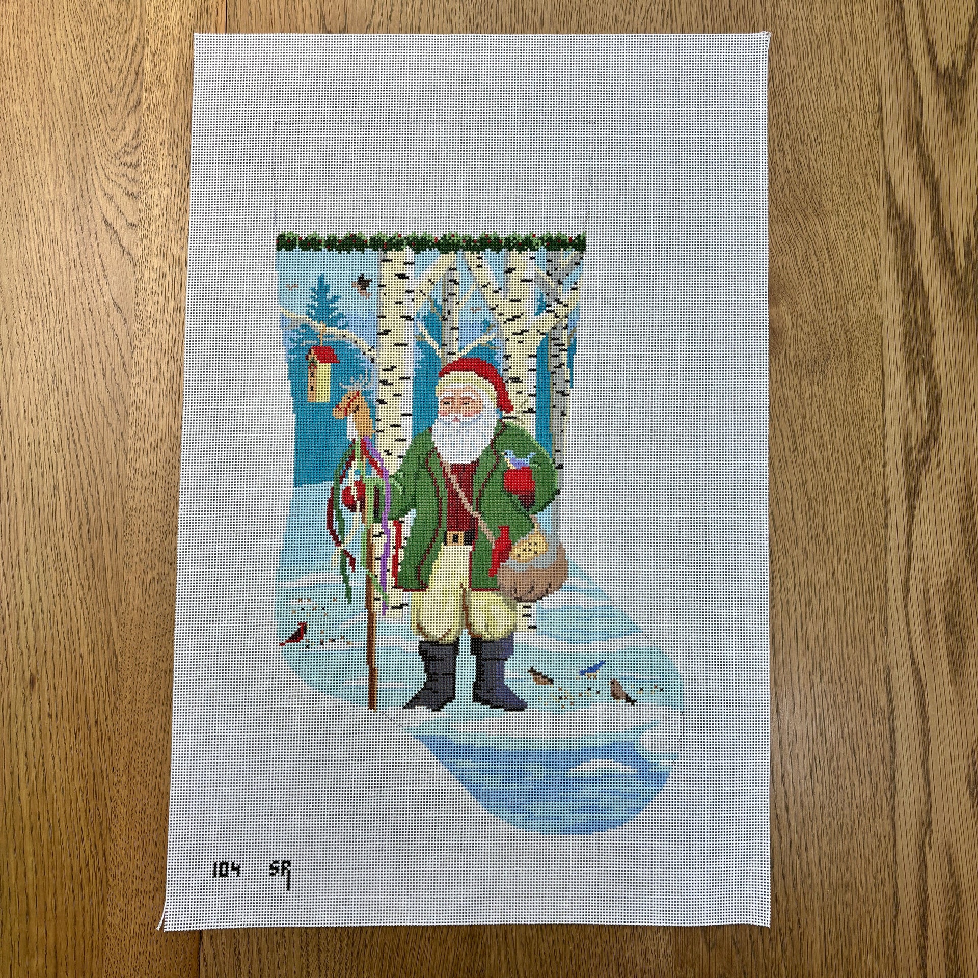 SR0104 Santa Feeding The Birds, Stocking - TS, 13 mesh, Handpainted by Susan Roberts, Design Size: 19" high