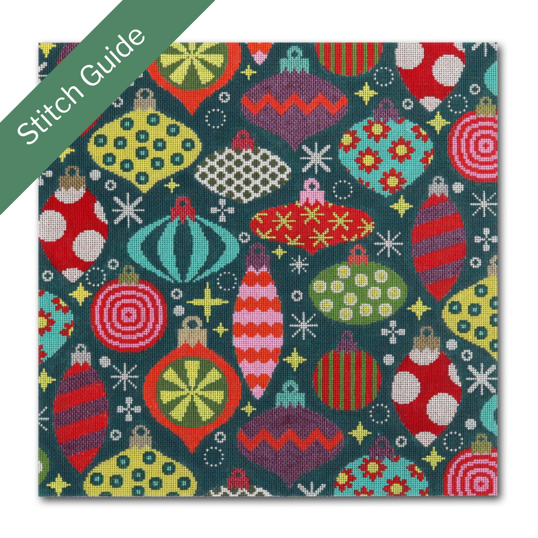 KR-PL 08 Xmas Ornaments, 18 mesh, Handpainted By Kate Rhees for CBK, Design size 12 x 12".