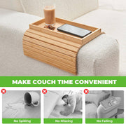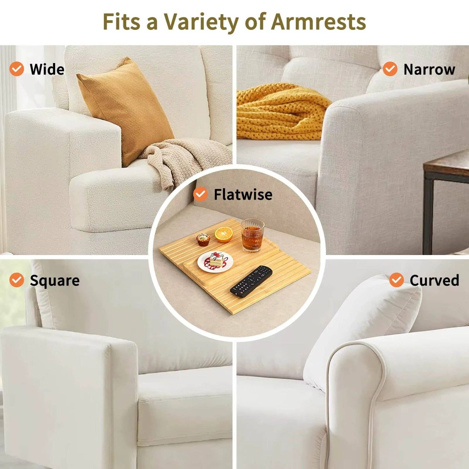 FITS VARIOUS SOFA ARMRESTS: Our sofa arm tray table for couches applies to most sofas, for wide armchairs, flat, rolls, and straight arms. It adapting to minimum armrest width 5'' flat to 18'' rolls or straight arms. (Measure Your Couch Arm Before Ordering). Our couch arm table can not only be placed on the armrest of the sofa, but can also be used flat, such as computer tray tables, beverage racks, meal mats, and food trays. etc. The foldable design is convenient for use and storage.