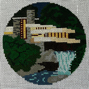 Fallingwater Ornament SS65, 18 mesh, Handpainted by The Squirrel and the Snail for The Gingham Stitchery, Design Size: 4" Round