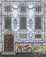 4710 Portuguese Facade with Bikes, 18 mesh, Handpainted by Alice Peterson, Design Size: 8 x 10"