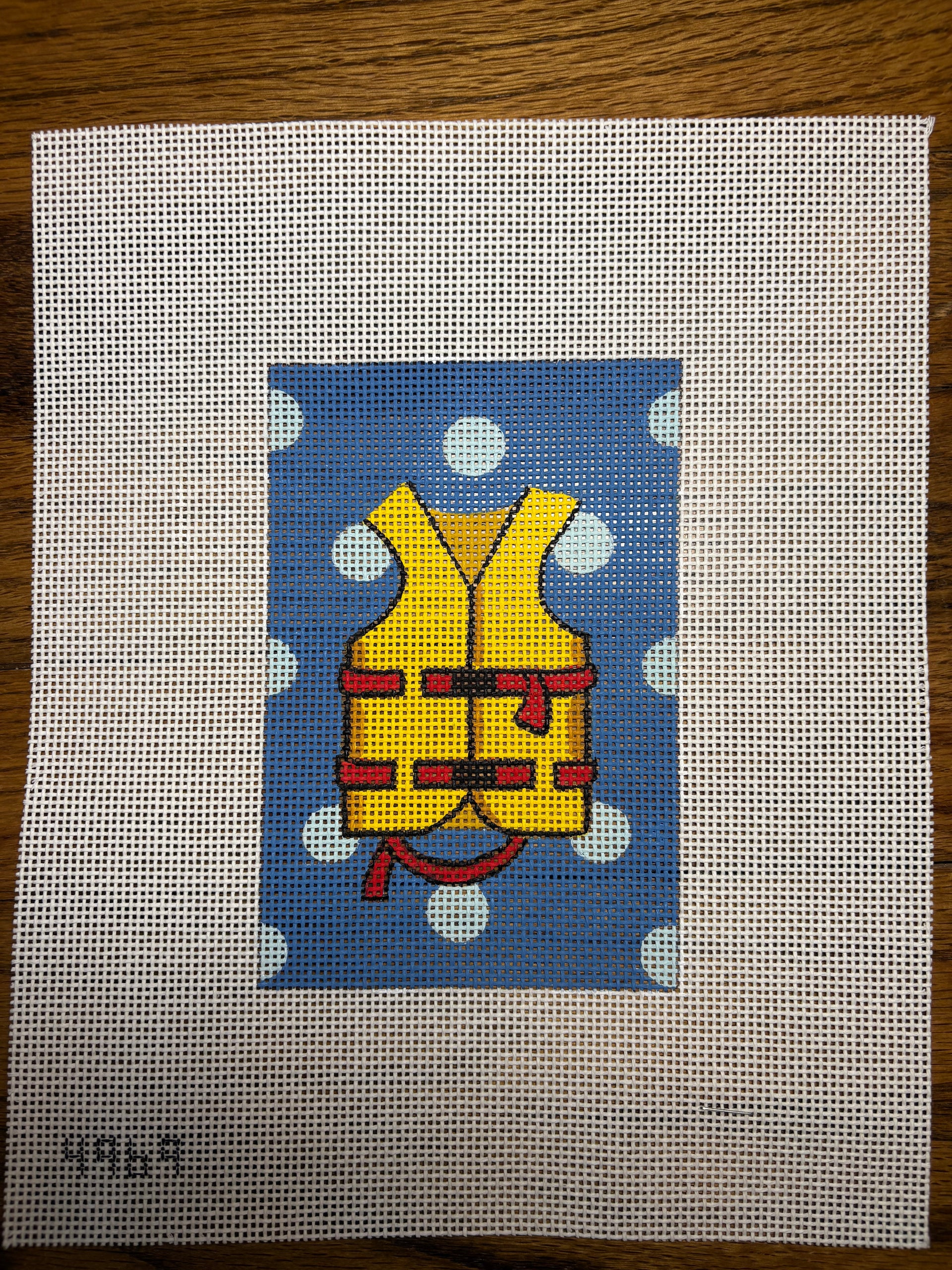 4969 Life Vest on Blue Polka Dots , 13 mesh, Handpainted by Alice Peterson, Design Size: 4 x 6"