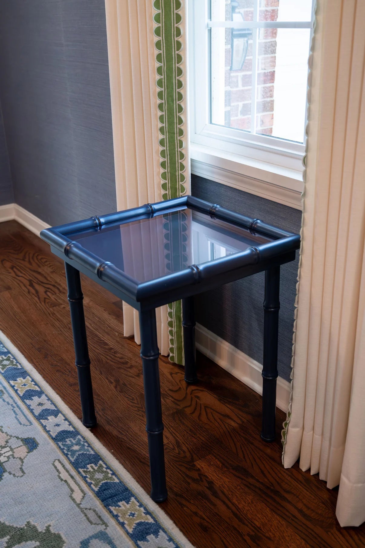 The Tempered Glass top sits up from the needlepoint to accommodate ribbon or stumpwork, and to protect your projects. The table is a perfect height for by a sofa or between chairs in a sitting room.