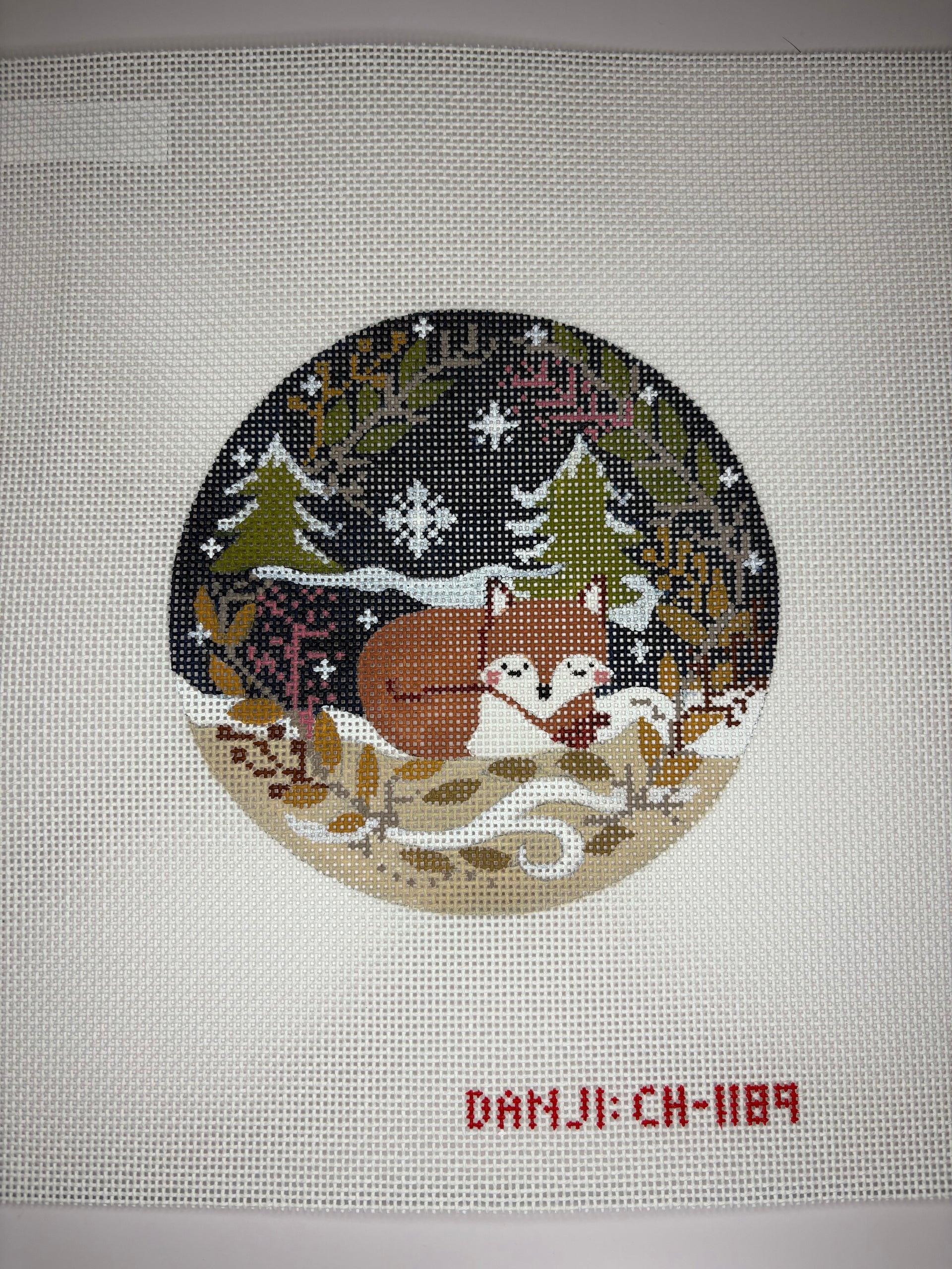 CH-1189 January Fox , 18 mesh, Handpainted by Danji Designs, Design Size: 4.75" Round