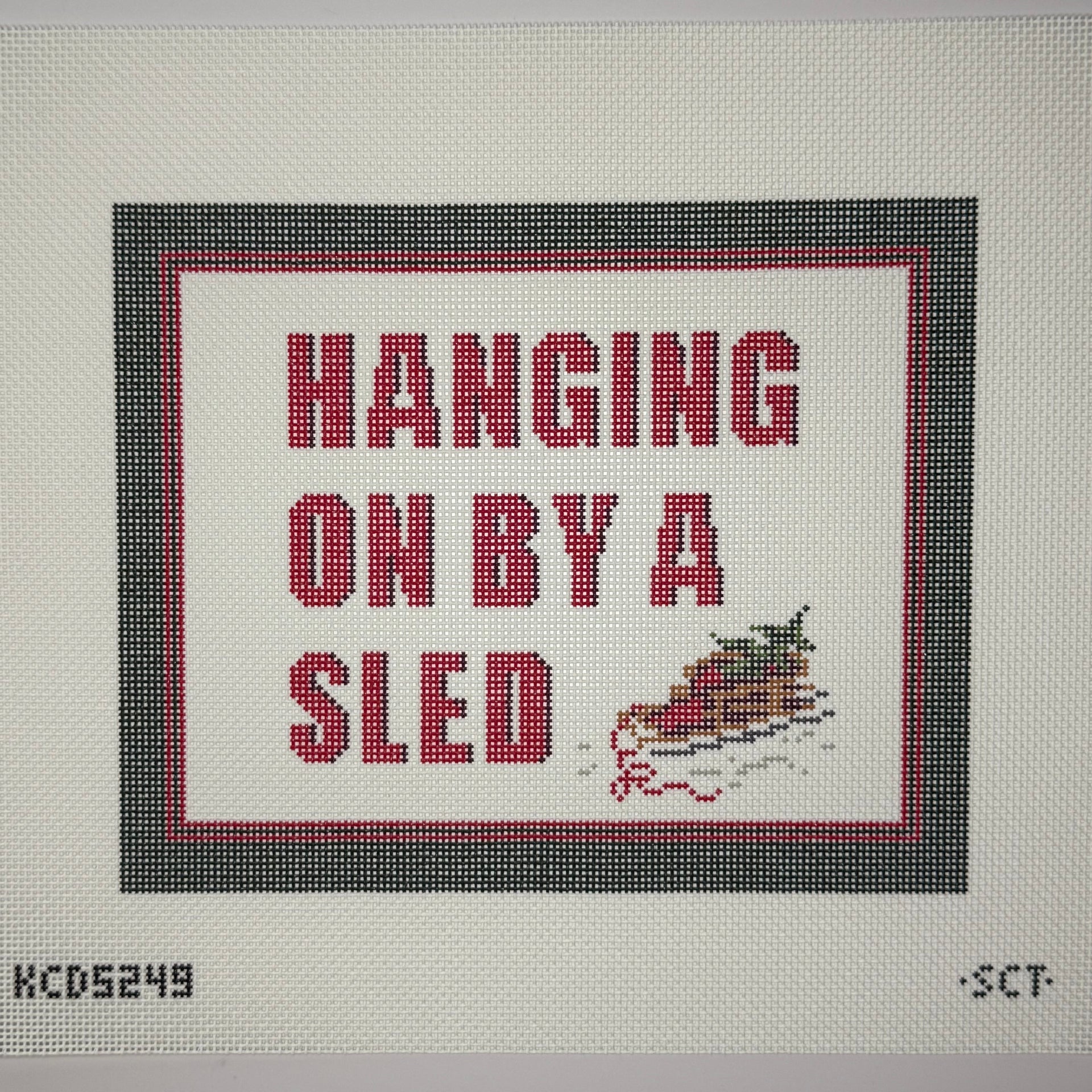 KCD5249 Hanging on By A Sled , 13 mesh, Designed by KC Needlepoint Designers Design Size: 9.75 x 7.5