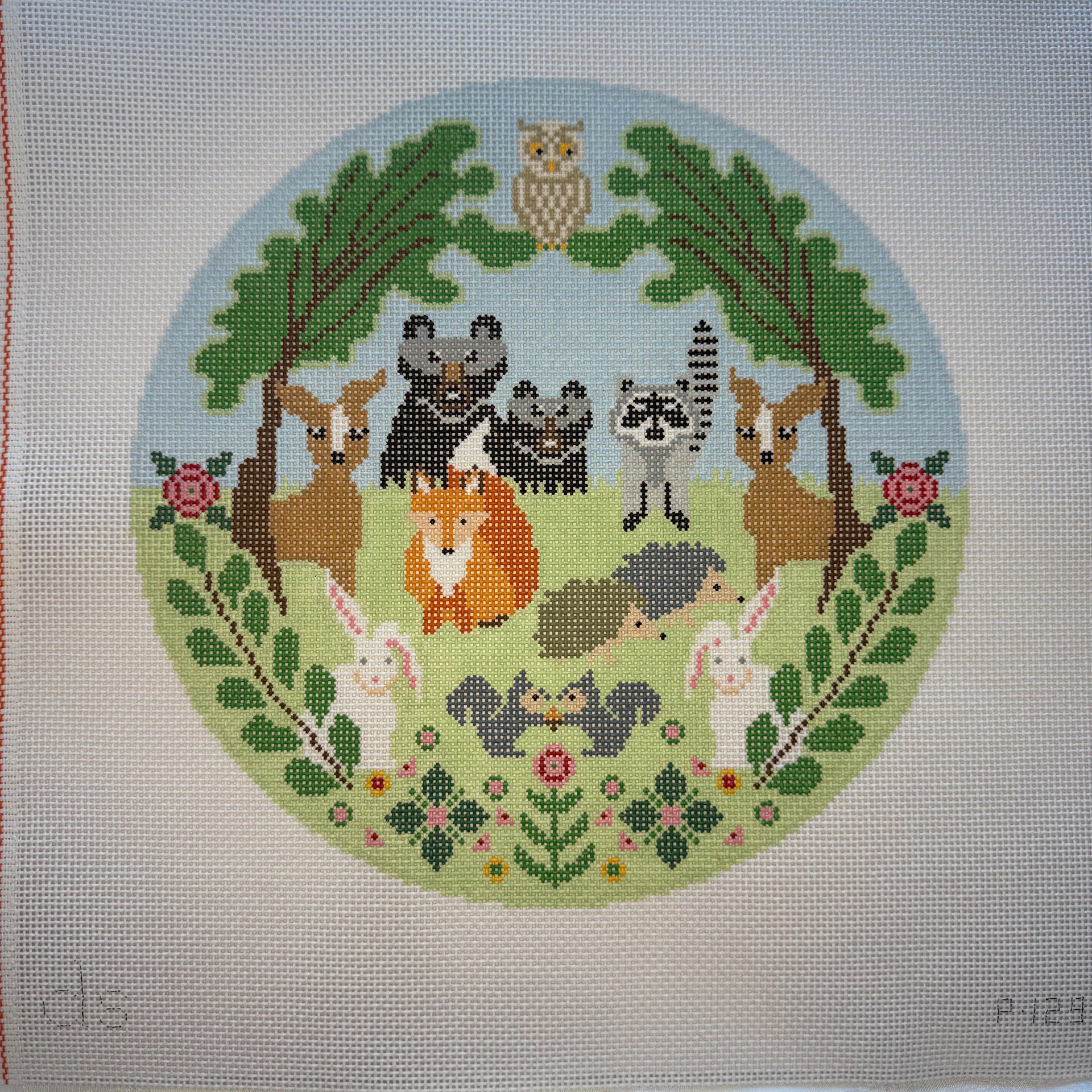 P-129 Forest Friends Pillow , 13 mesh, Handpainted by Doolittle Stitchery, Design Size: 10.5" round