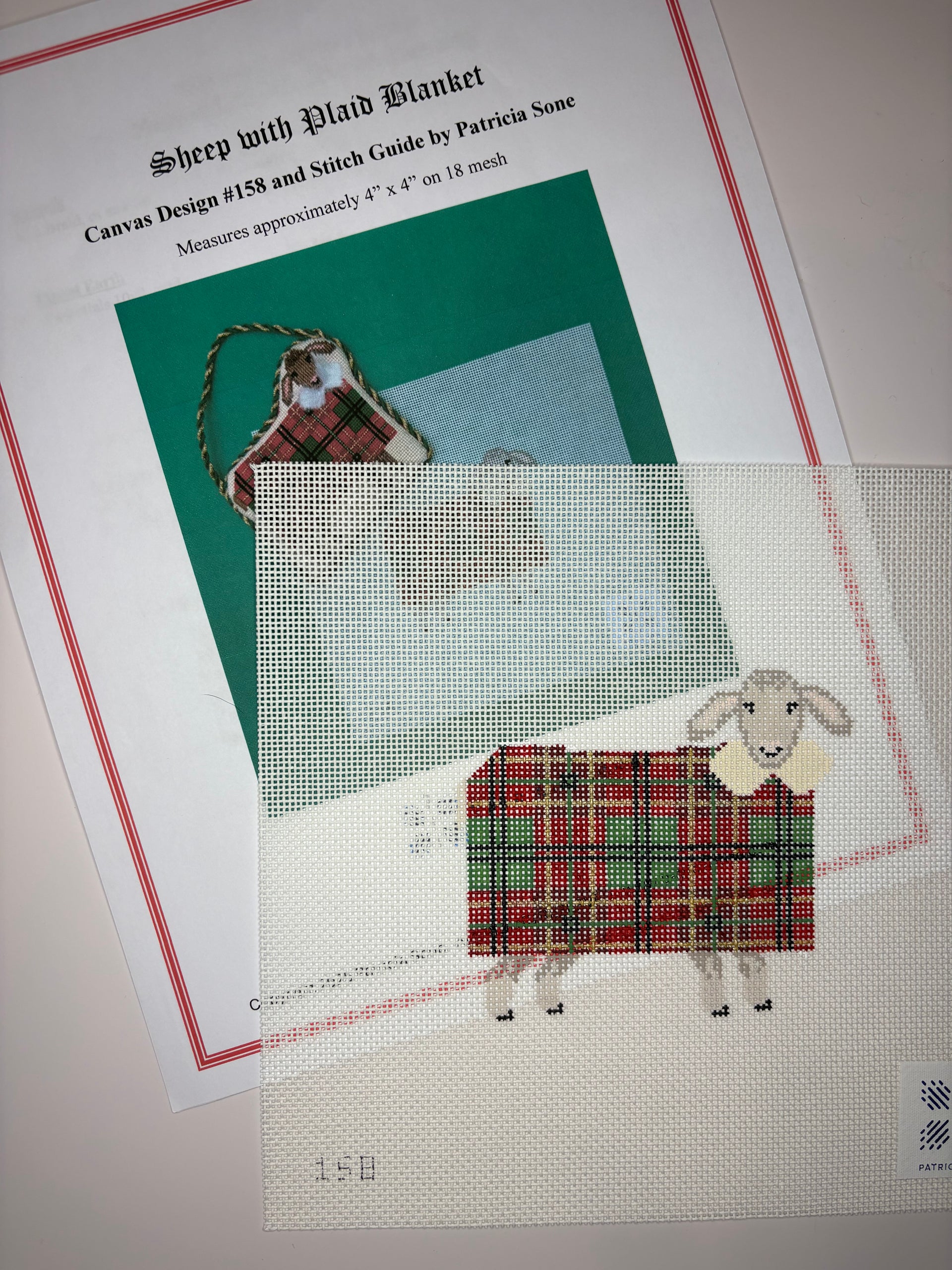 Sheep Red Plaid with stitch guide , 18 mesh, Handpainted by Patricia Sone, Design Size: 4 x 4"