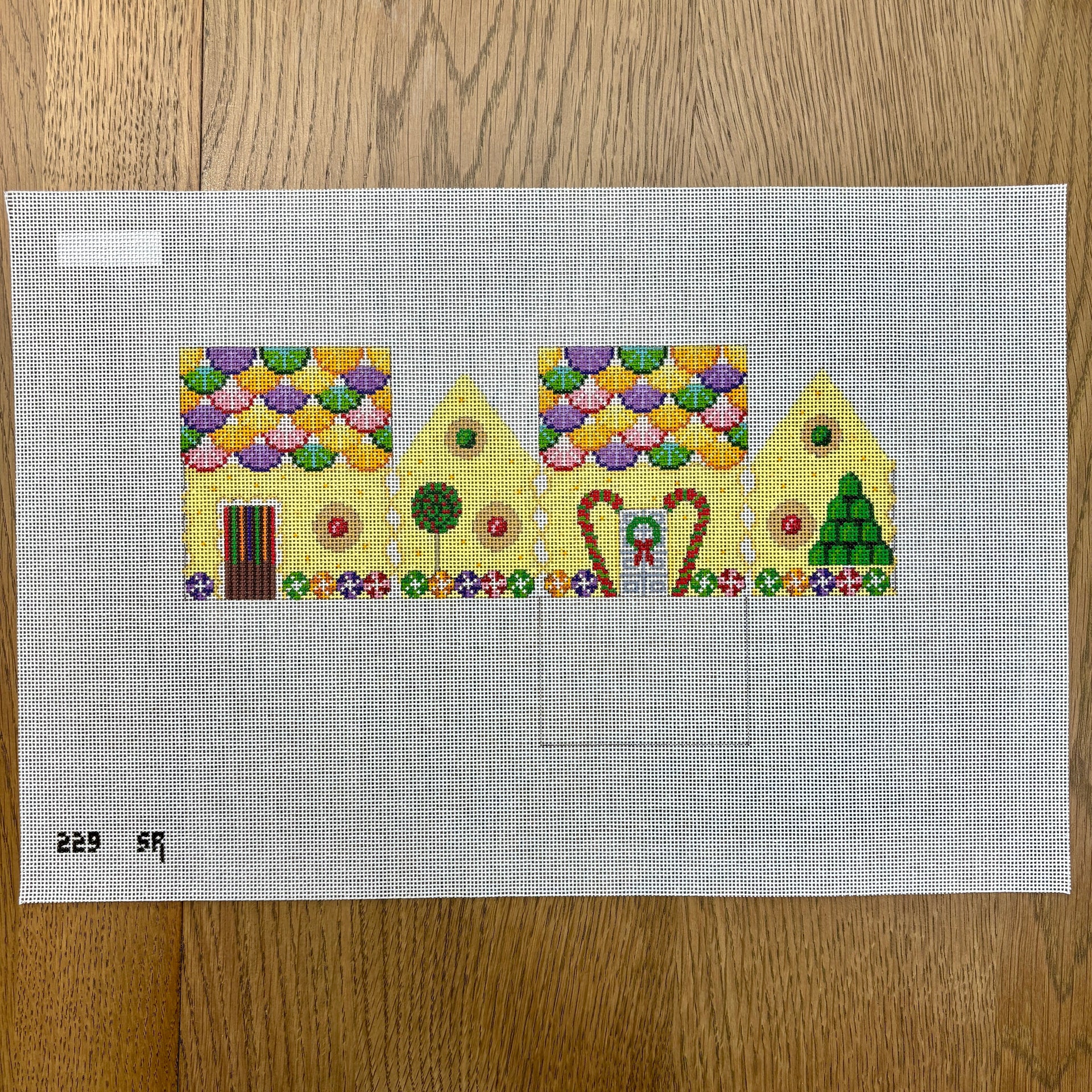 SR0229-18 Lemon Chiffon and Fruit Slices, 3D Gingerbread House - 18 mesh - TS, 18 mesh, Handpainted by Susan Roberts, Design Size: 10.5 x 6"; 2.25 x 3 x 3.25" finished size