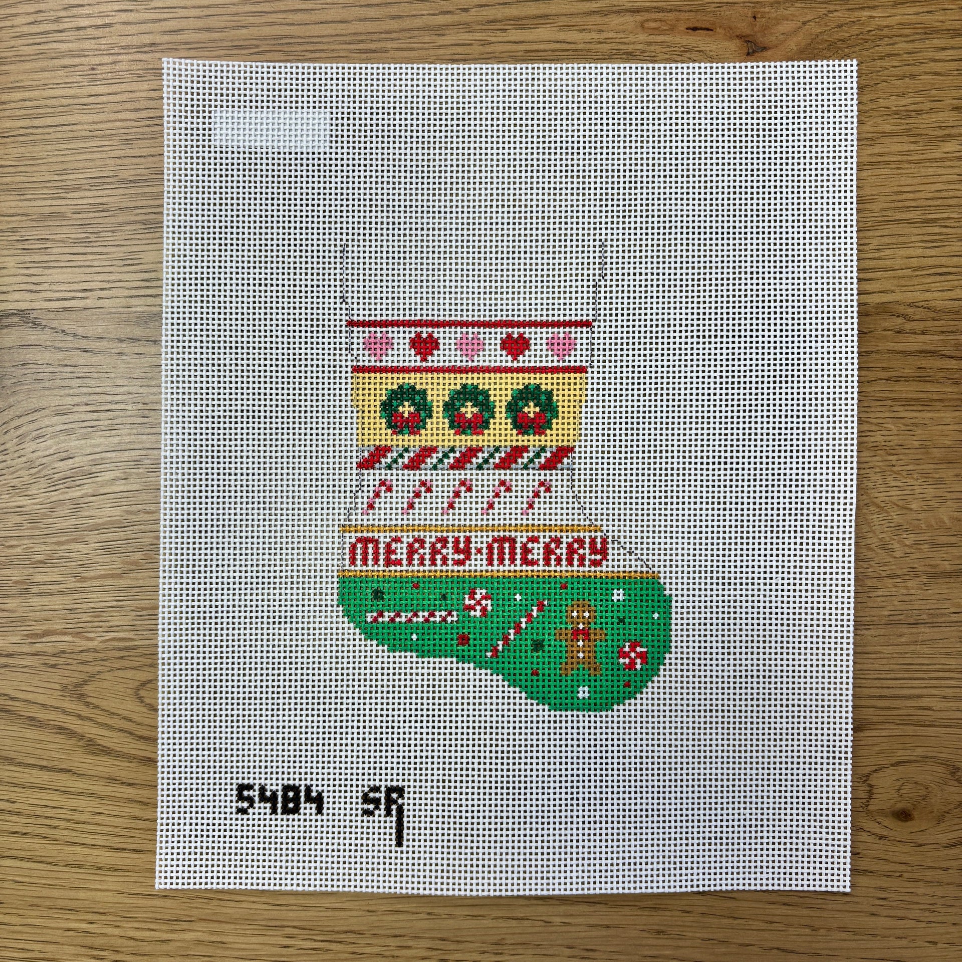 SR5484 Wreath and Candy Stripe - Mini Stocking - TS, 13 mesh, Handpainted by Susan Roberts, Design Size: 6.25" tall