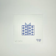 MESH: 13 mesh, DESIGN SIZE: 4 x 4â€, DESIGNER: A Poore Girl Paints. This stitch painted needlepoint canvas features a gift box with a blue and light blue design.