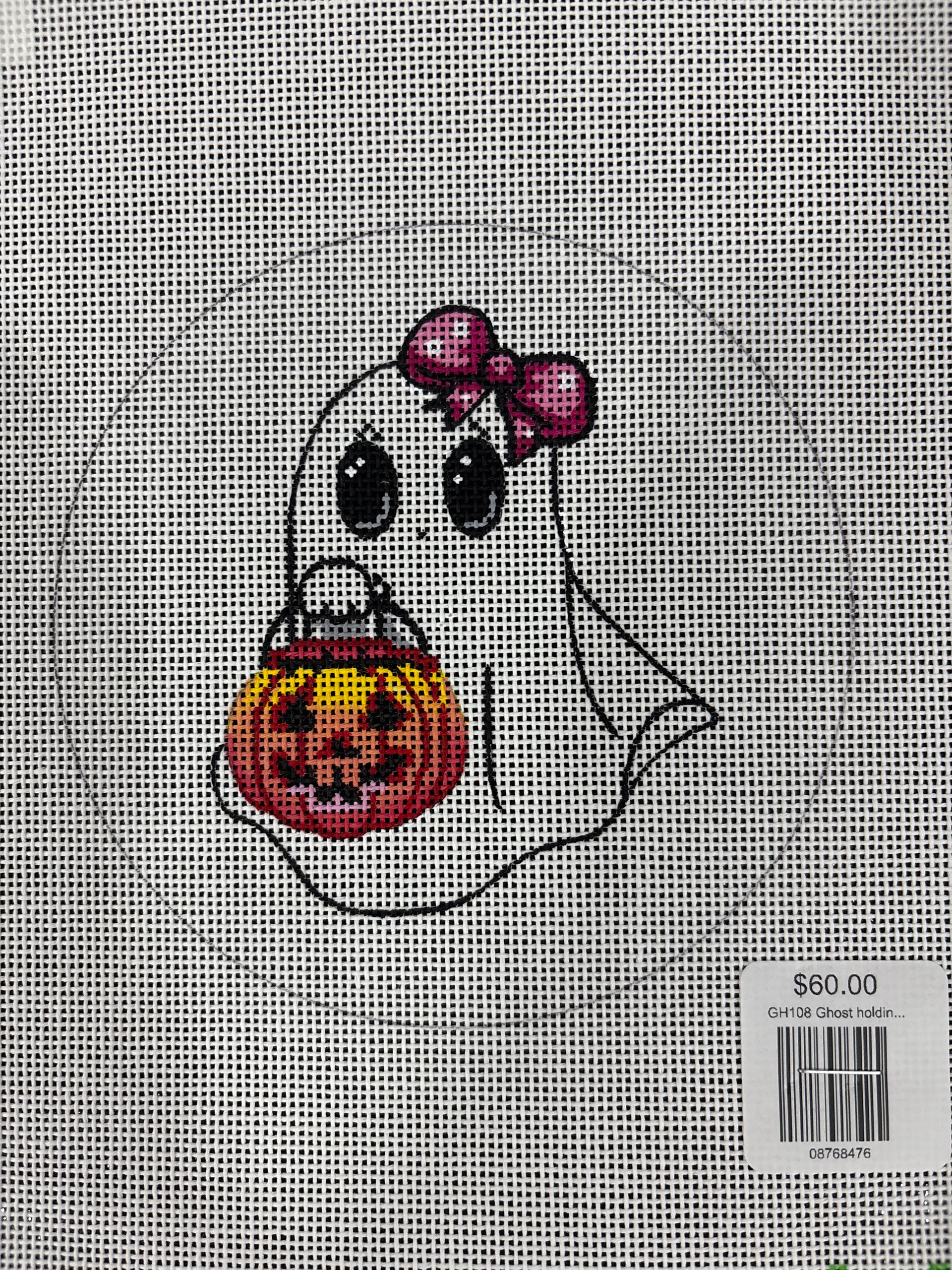 GH108 Ghost holding Pumpkin with Bow in Hair, 18 mesh, Handpainted by The Collection, Design Size: