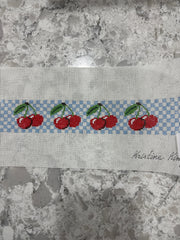 KKF09A Cherries on Blue White Checks Fob, 18 mesh, Handpainted by Kristine Kingston for Chris Lewis Distributing, Design Size: 1.5 x 9"