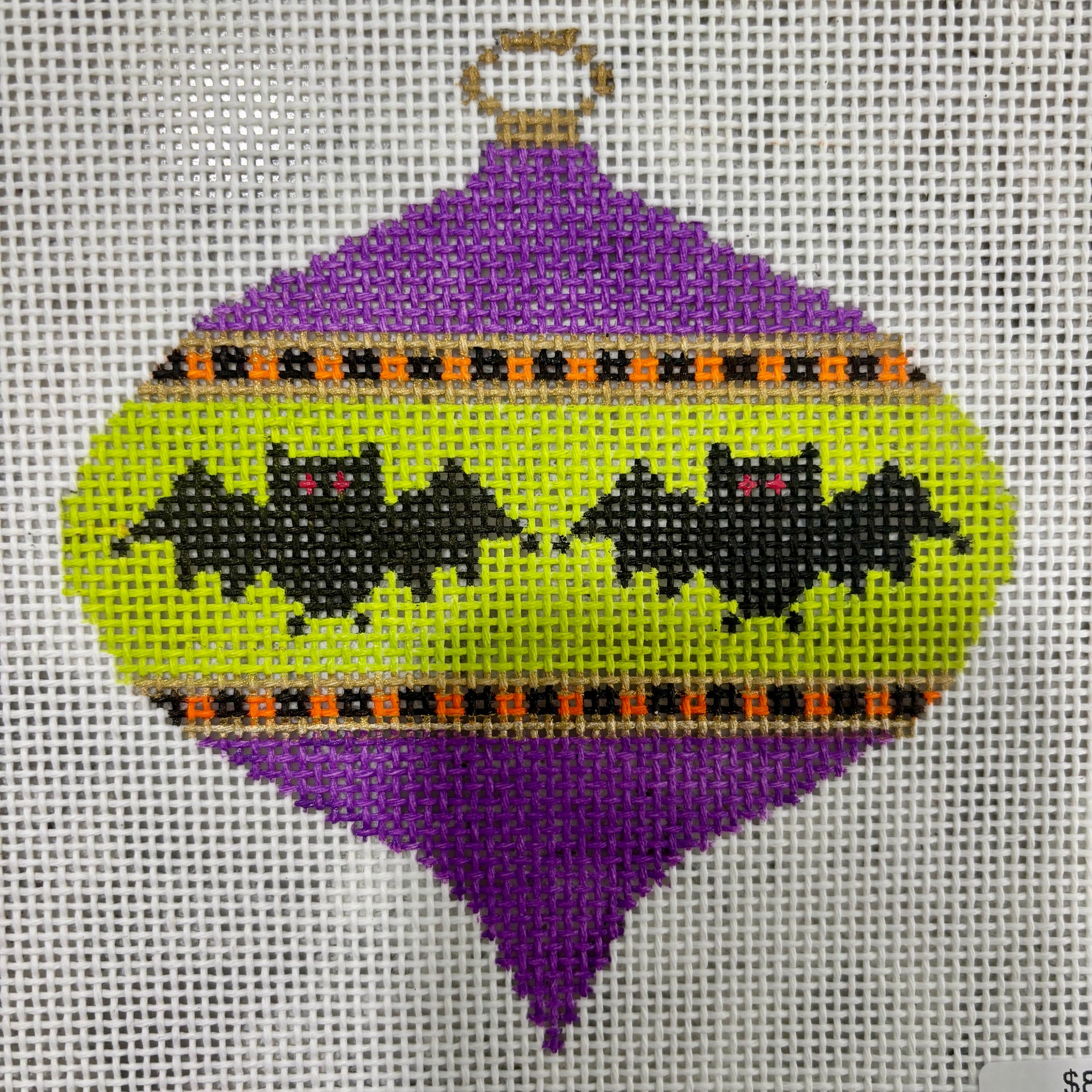 KKO241B-13 Oval Bauble with Bats on Purple and Lime, 13 mesh, Handpainted by Kristine Kingston for Chris Lewis Distributing, Design Size: 3.25 x 3.5"