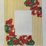 KW024 Geranium Frame - TS, 18 mesh, Designed by Kate Woodward for the Gingham Stitchery, Design Size: 10.5 x 8.5", frame opening 4 x 6"