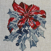 KW040 Blue Holly with Red Bow - TS, 18 mesh, Designed by Kate Woodward for the Gingham Stitchery, Design Size: 4.5 x 3.75"
