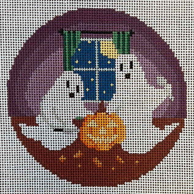 MS31 Ghosts Carving Pumpkins - TS, 18 mesh, Designed by Maddie Sweet Designs for the Gingham Stitchery, Design Size: 4" Round