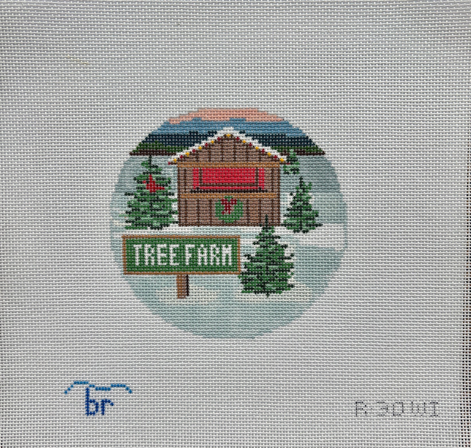 R30-wi Seasons: Winter - Tree Farm, 18 mesh, Handpainted by Blue Ridge Stitchery, Design Size 4.25" round