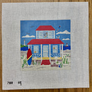 SR0788 Blue Beach Cottage Square - TS, 18 mesh, Handpainted by Susan Roberts, Design Size: 6.25 x 6.25"