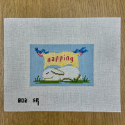 SR0802 "Napping" Sleeping Bunny, Sign - 13 mesh - TS, 13 mesh, Handpainted by Susan Roberts, Design Size: 5.75 x 3.75"