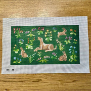 SR1151 Cluny Rabbits and Hound - 13 mesh - TS, 13 mesh, Handpainted by Susan Roberts, Design Size: 18 x 10"