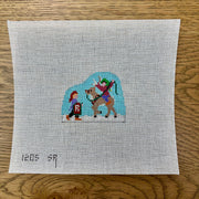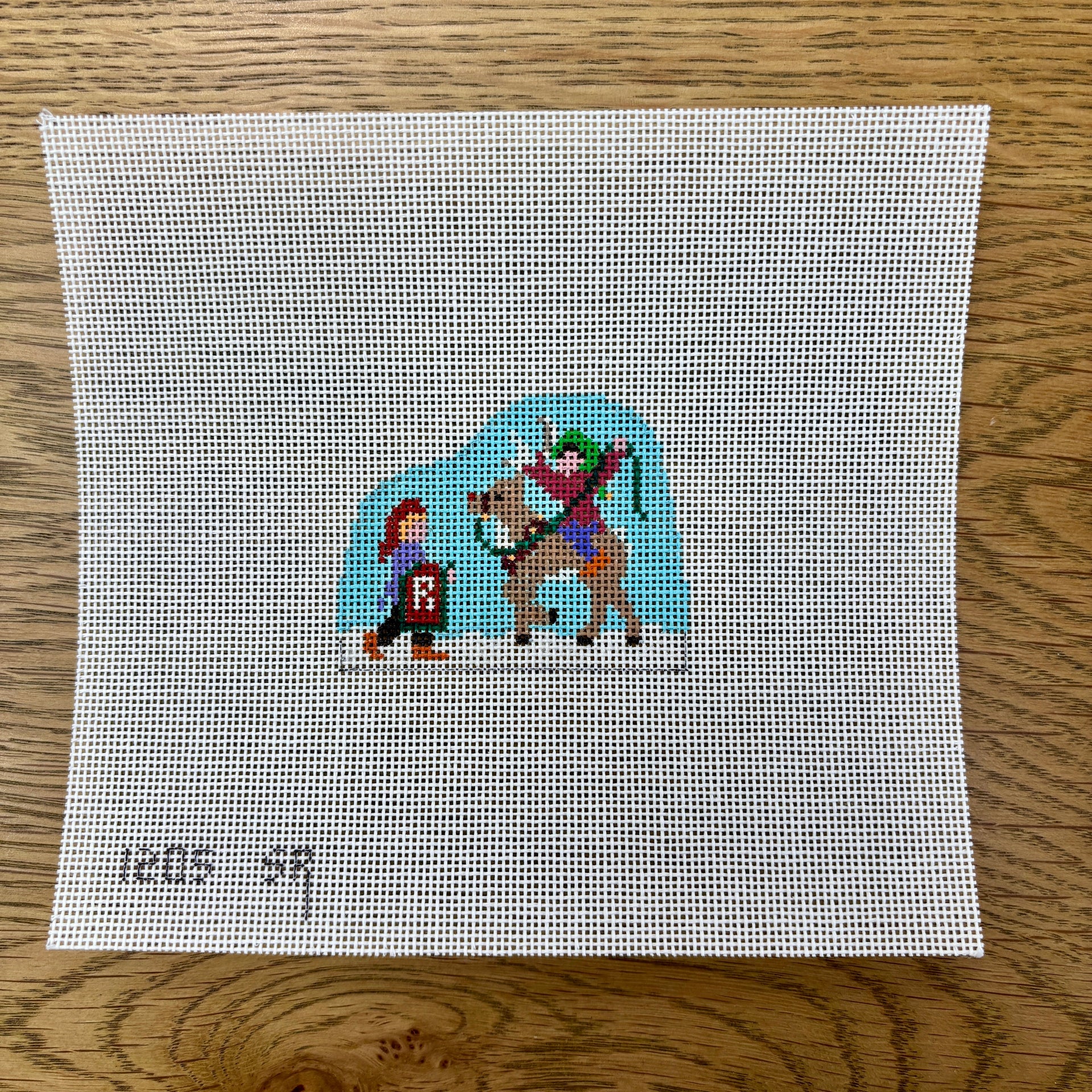 SR1205 Santa's Village, Elves Riding Rudolph - 18 mesh - TS, 18 mesh, Handpainted by Susan Roberts, Design Size: 3 x 2.25"