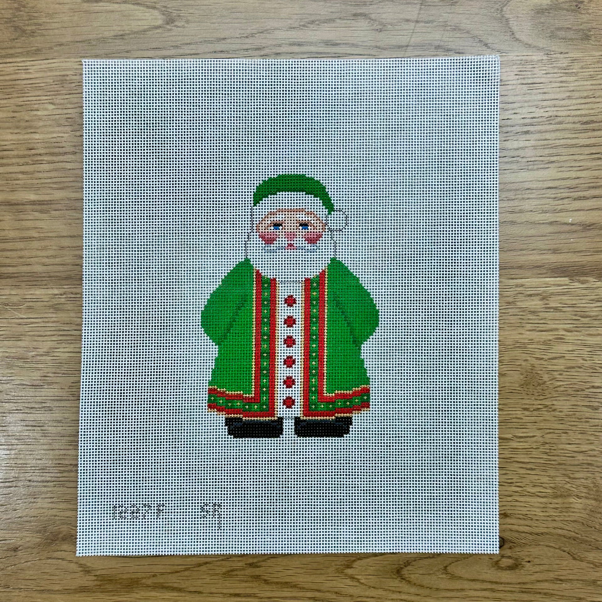 SR1227f Green Coat Santa with Present - 18 mesh - TS, 18 mesh, Handpainted by Susan Roberts, Design Size: 5" tall