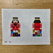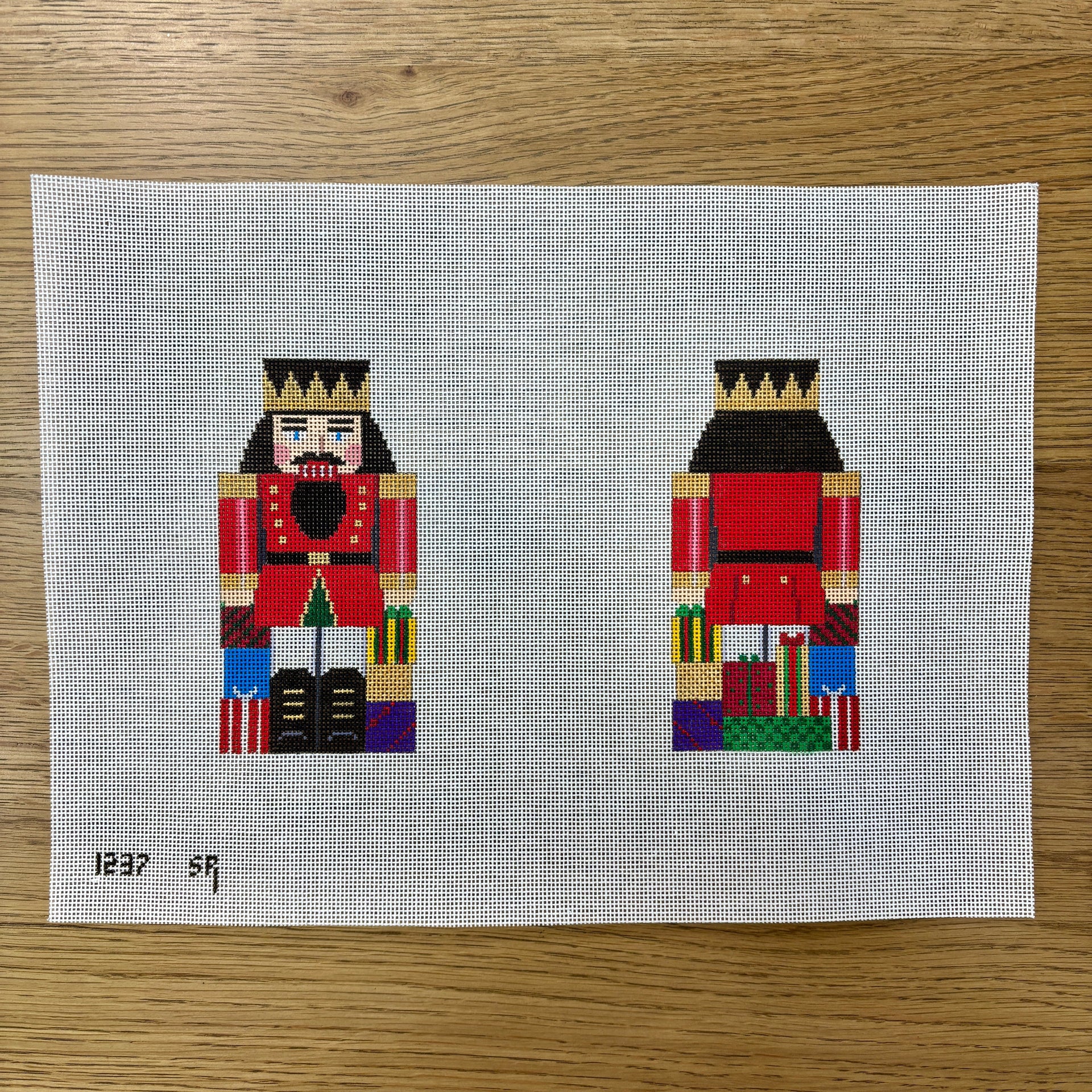 SR1237 Nutcracker with Present, 2 Sided - 18 mesh - TS, 18 mesh, Handpainted by Susan Roberts, Design Size: 5" tall, 2 sided
