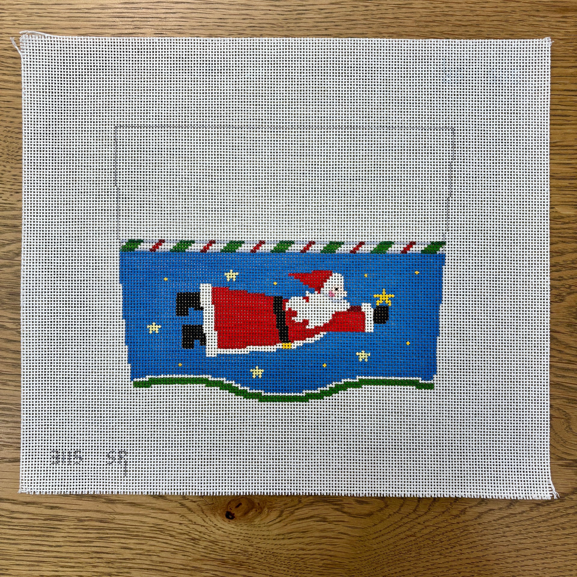 SR3115 Stocking Cuff, Santa Flying - TS, 13 mesh, Handpainted by Susan Roberts, Design Size: 9 x 7"