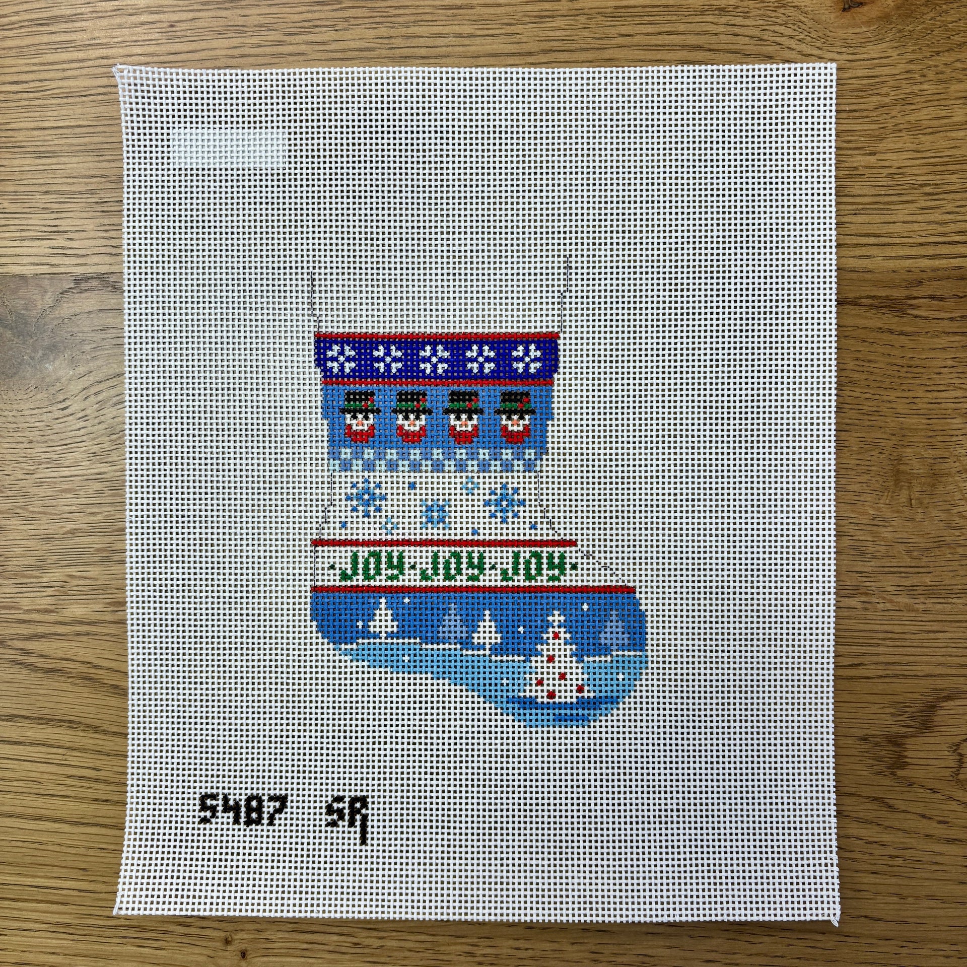 SR5487 Snowman, Snowflakes, Trees Stripe - Mini Stocking - TS, 13 mesh, Handpainted by Susan Roberts, Design Size: 6.25" tall