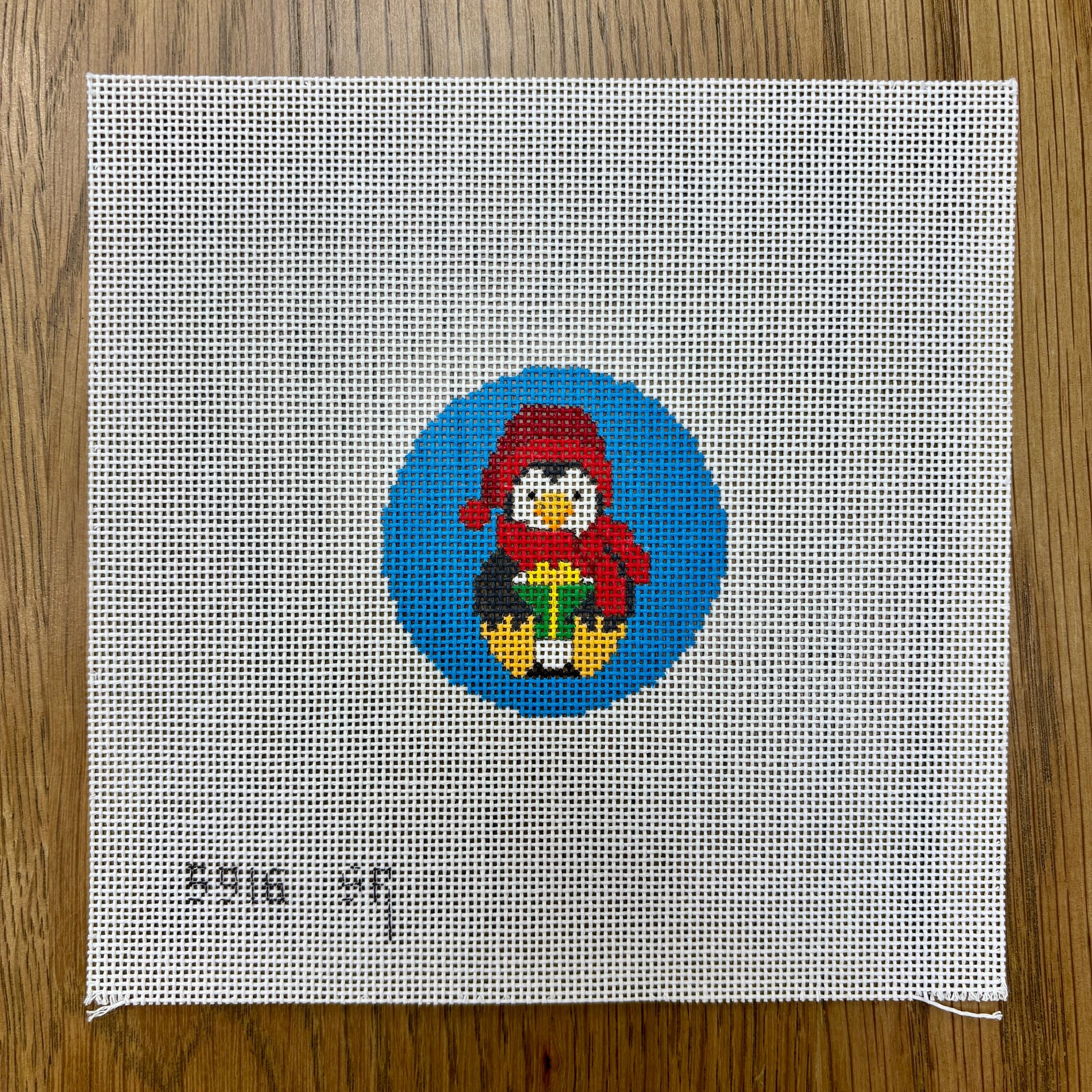 SR5916 Penguin with Gift, 2.5" Round - TS, 18 mesh, Handpainted by Susan Roberts, Design Size: 2.5" Round