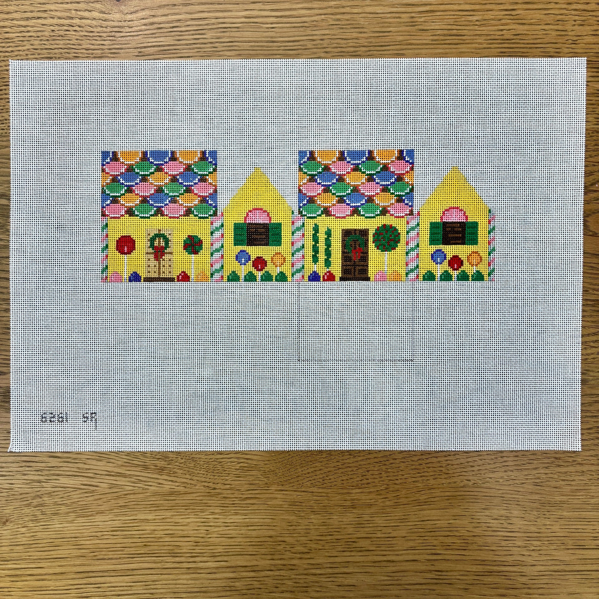 SR6261 Fruit Slice and Lollipops, 3D Gingerbread House - 18 mesh - TS, 18 mesh, Handpainted by Susan Roberts, Design Size: 10.5 x 5.5"; 2.25 x 3.25 x 3.25" finished size