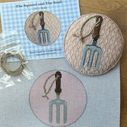 SS11 Garden Icons-Rake (includes guide) - TS, 18 mesh, Designed by The Squirrel and The Snail for the Gingham Stitchery, Design Size: 4" Round