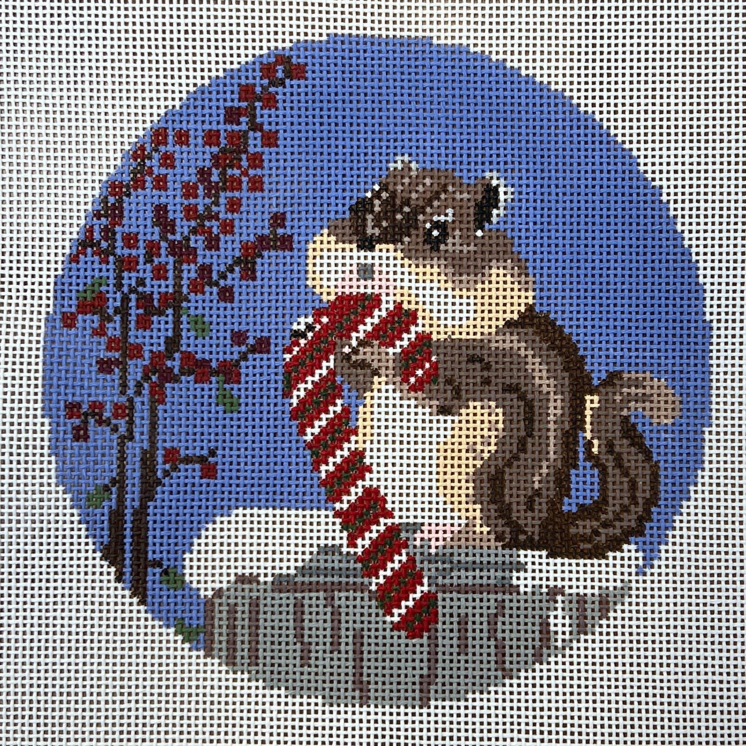 SS42 Winter Sweets Chipmunk - TS, 18 mesh, Designed by The Squirrel and The Snail for the Gingham Stitchery, Design Size: 5" Round