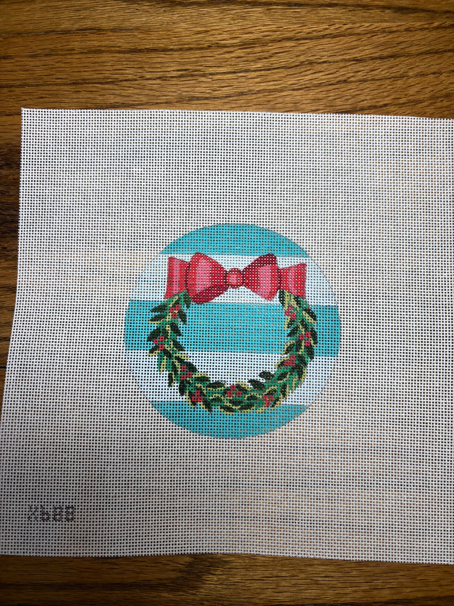 X688 Wreath with Bow Round , 18 mesh, Handpainted by Alice Peterson, Design Size: 4" Round