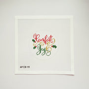 This stitch painted needlepoint canvas features the phrase "Comfort & Joy" with elegant holly leaves and a shimmering gold flourish.