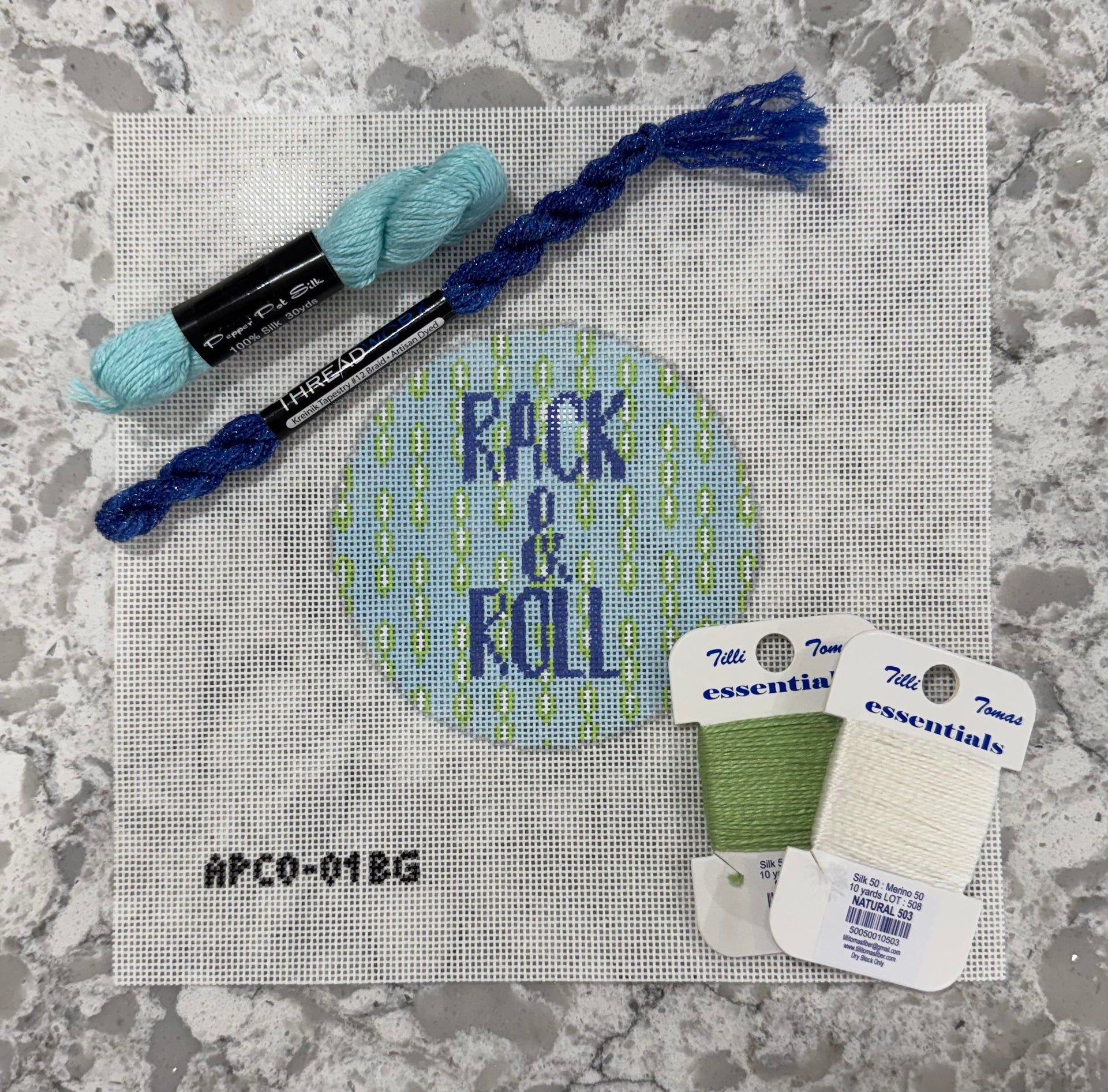 MESH: 18 mesh, DESIGN SIZE: 4" round, DESIGNER: A Poore Girl Paints. This stitch painted canvas for the mahjong lover features the phrase Rack & Roll in a blue and green color way.