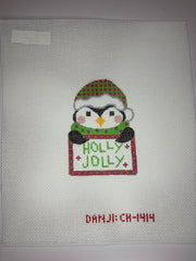 CH-1414 Penguin Tag - Holly Jolly 18 mesh, Handpainted by Danji Designs, Design Size: 4 x 3"