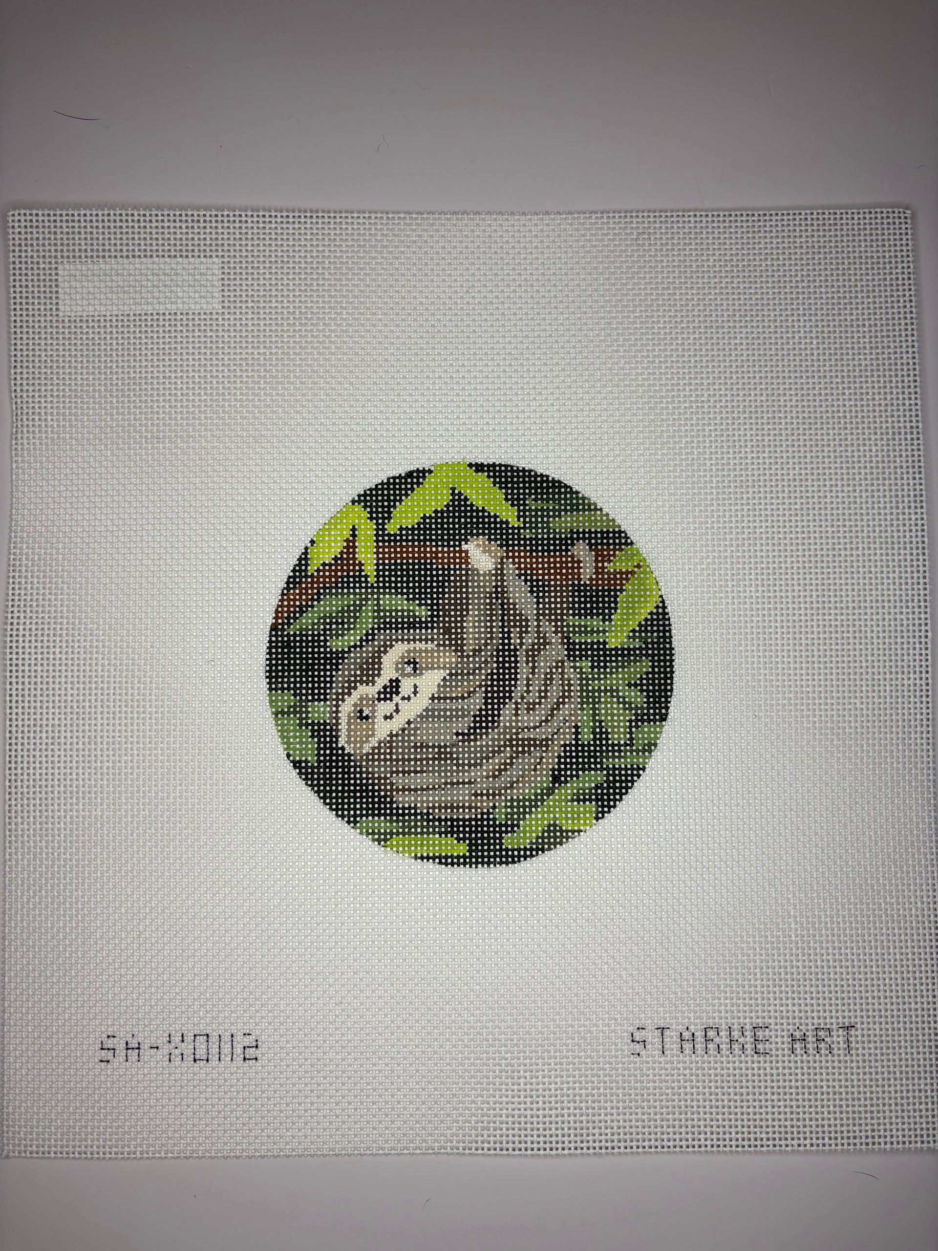 SA-XO 112 Sloth Round , 18 mesh, Handpainted by Pepperberry Designs, Design Size: 3.75" Round
