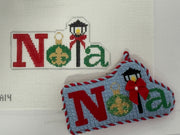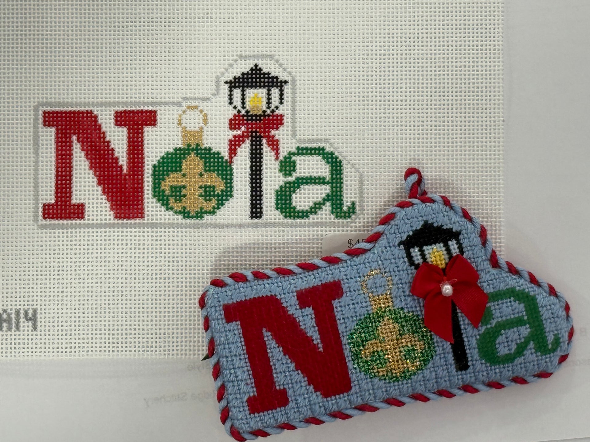 NA14 NOLA Christmas, mesh, Handpainted by Jude Designs on 18 mesh. Design size approximately 4.25" wide x 2.25" tall.