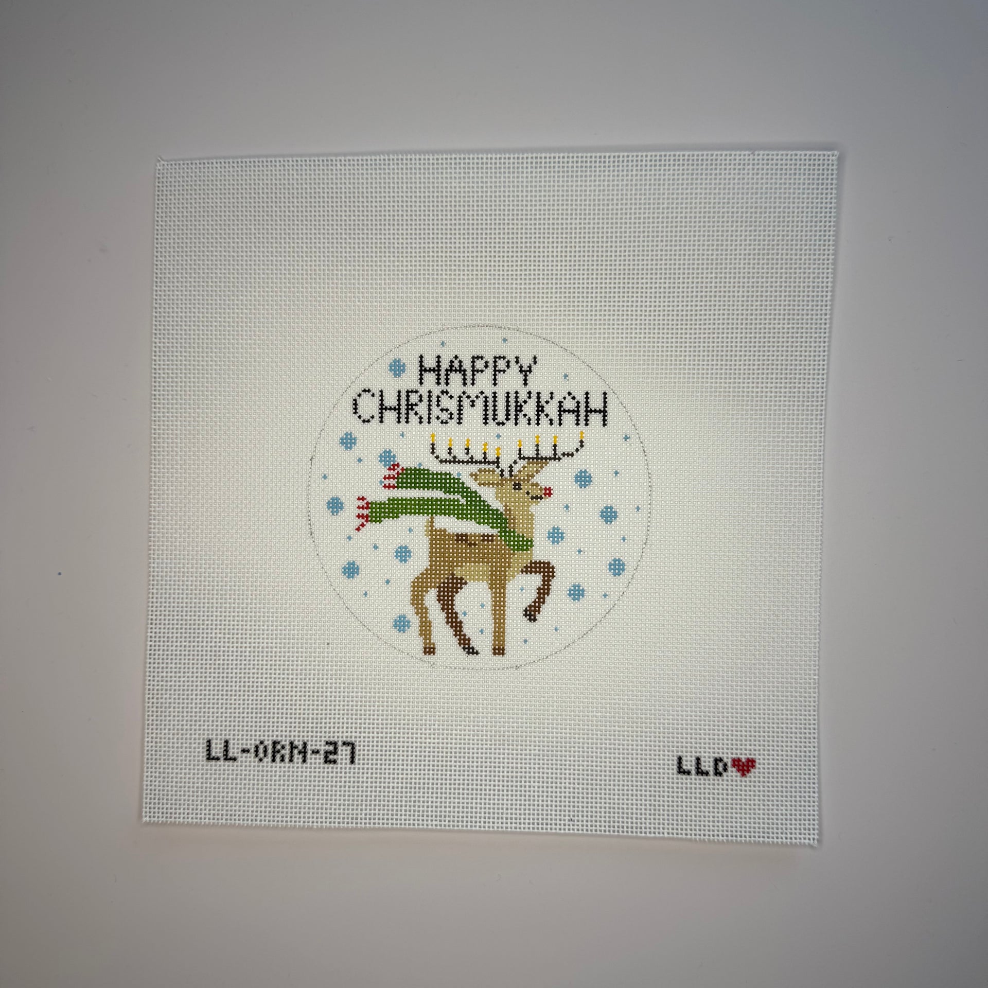 Happy Chrismakkuh Reindeer Ornament LL-ORN-27, 18 mesh, Handpainted by LauraLove Designs, Design Size: 4.5" round
