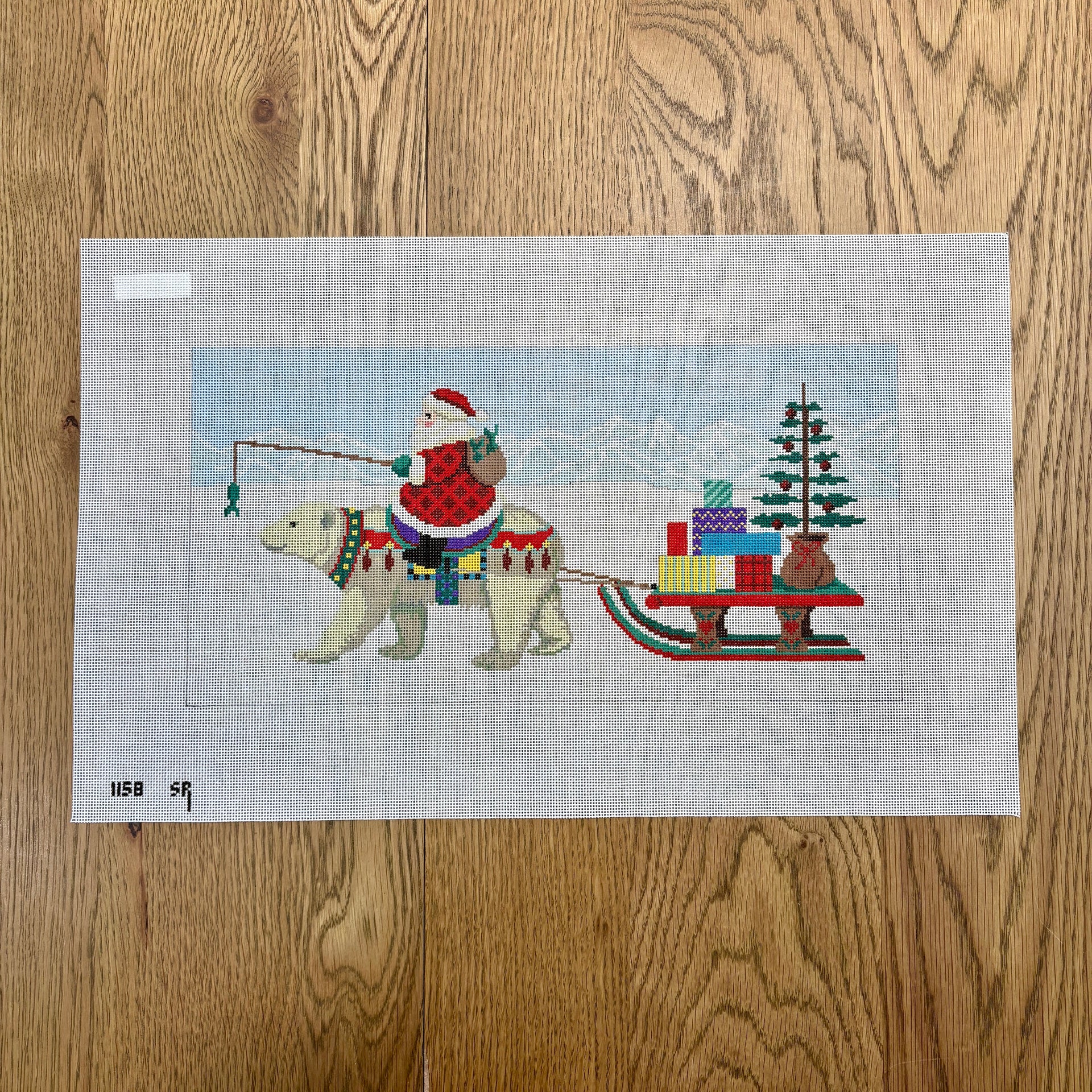 SR1158 Santa Riding Polar Bear with Sled - 18 mesh - TS, 18 mesh, Handpainted by Susan Roberts, Design Size: 14 x 7"
