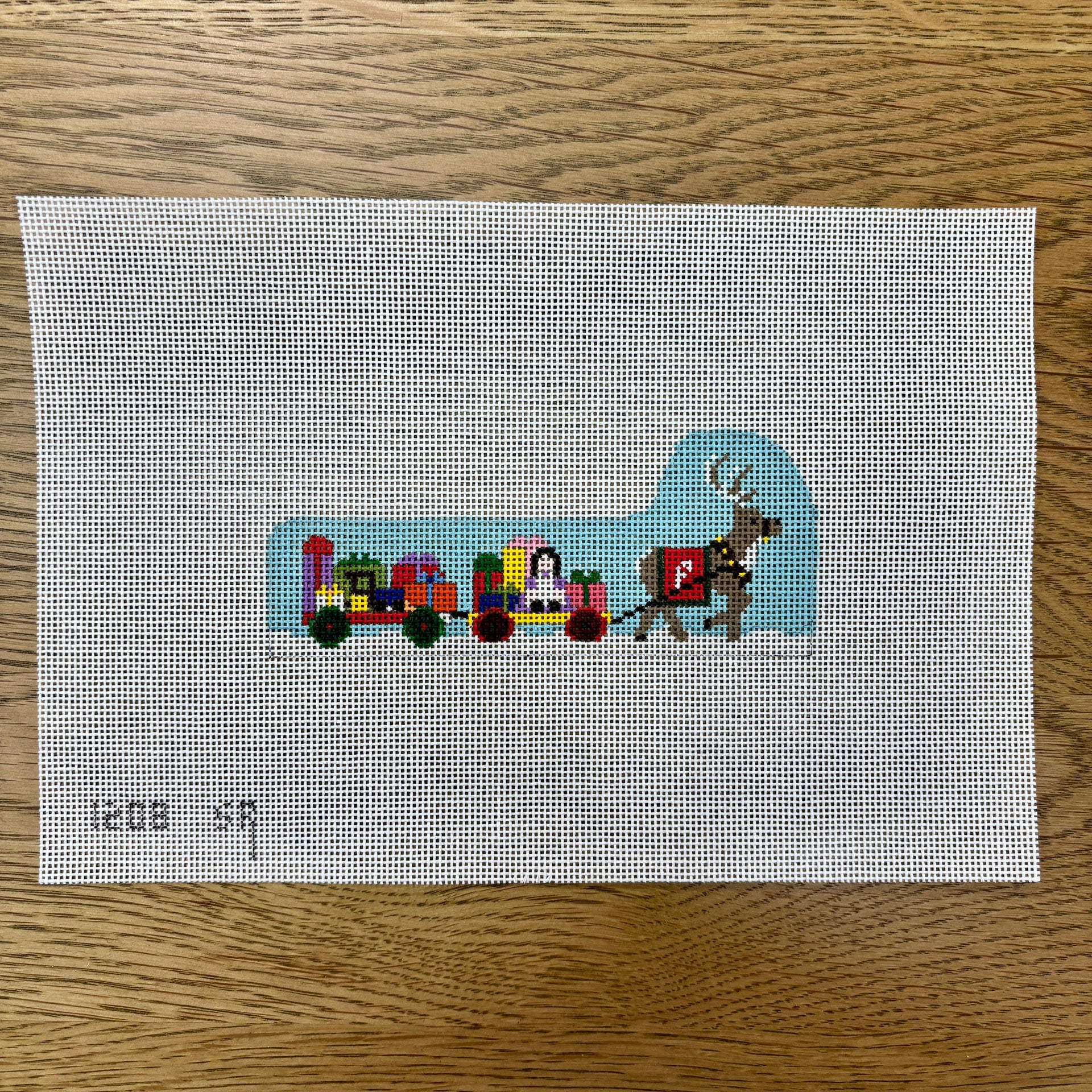 SR1208 Santa's Village, Prancer Pulling Toy Wagons - 18 mesh - TS, 18 mesh, Handpainted by Susan Roberts, Design Size: 5.25 x 2"
