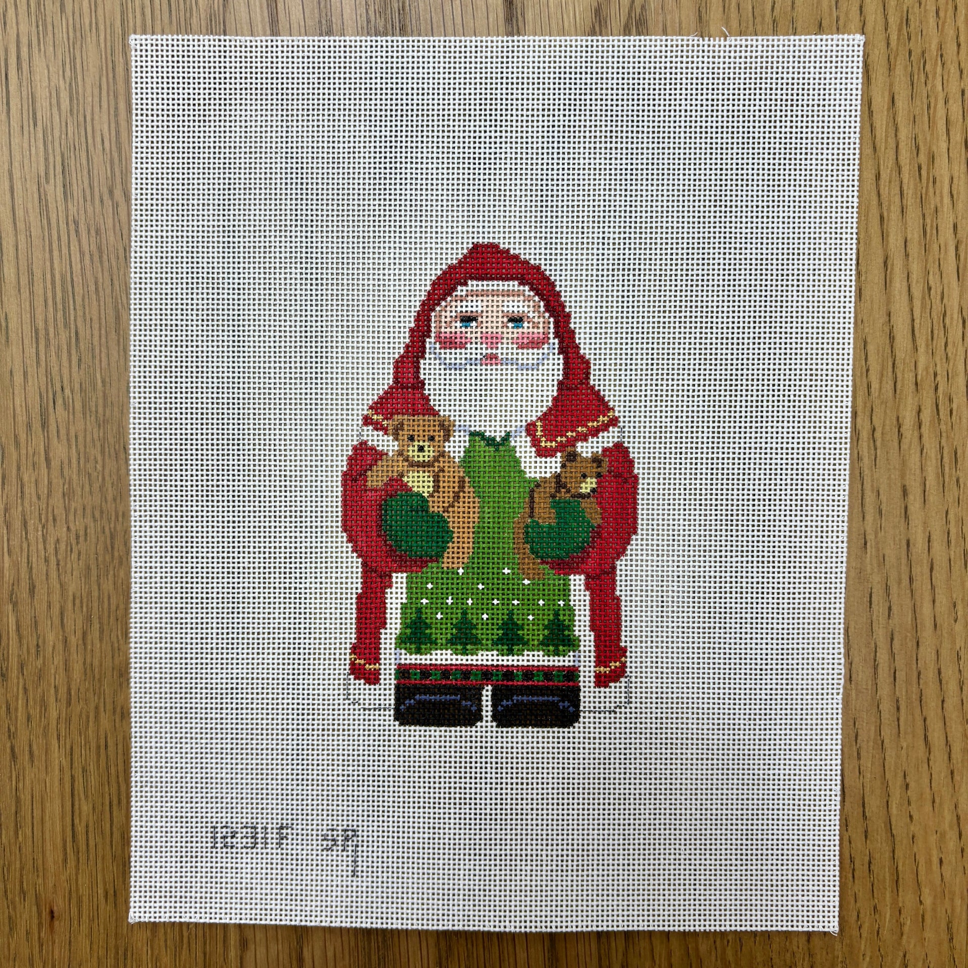 SR1231F Tree Coat Santa with Teddies - 18 mesh - TS, 18 mesh, Handpainted by Susan Roberts, Design Size: 5" tall