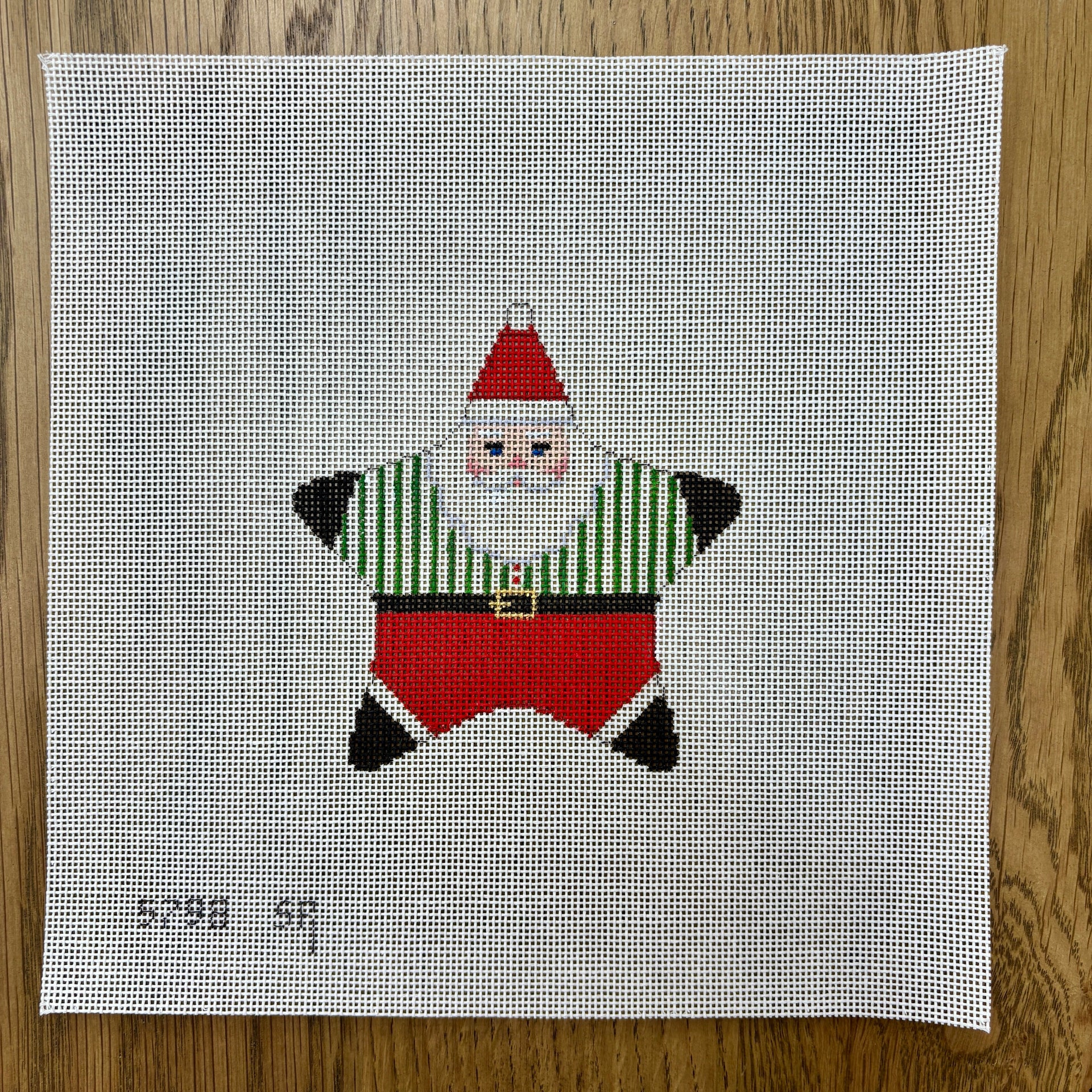 SR5798 Star, Santa, Green Stripe Shirt - TS, 18 mesh, Handpainted by Susan Roberts, Design Size: 4 x 4.25"