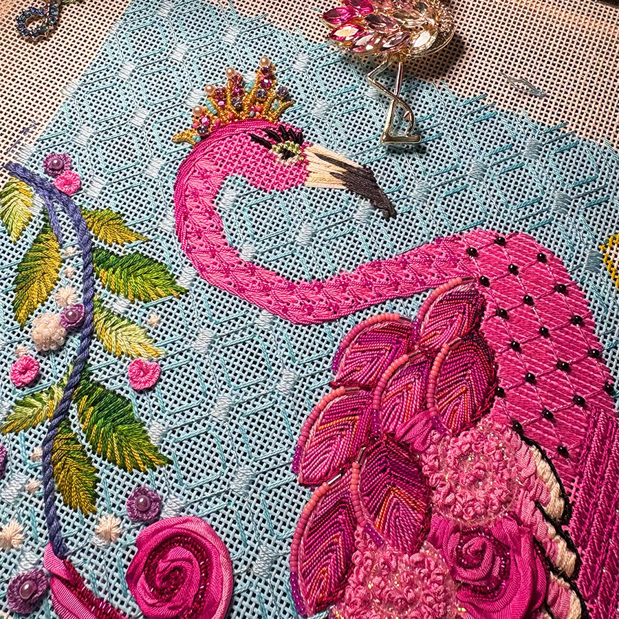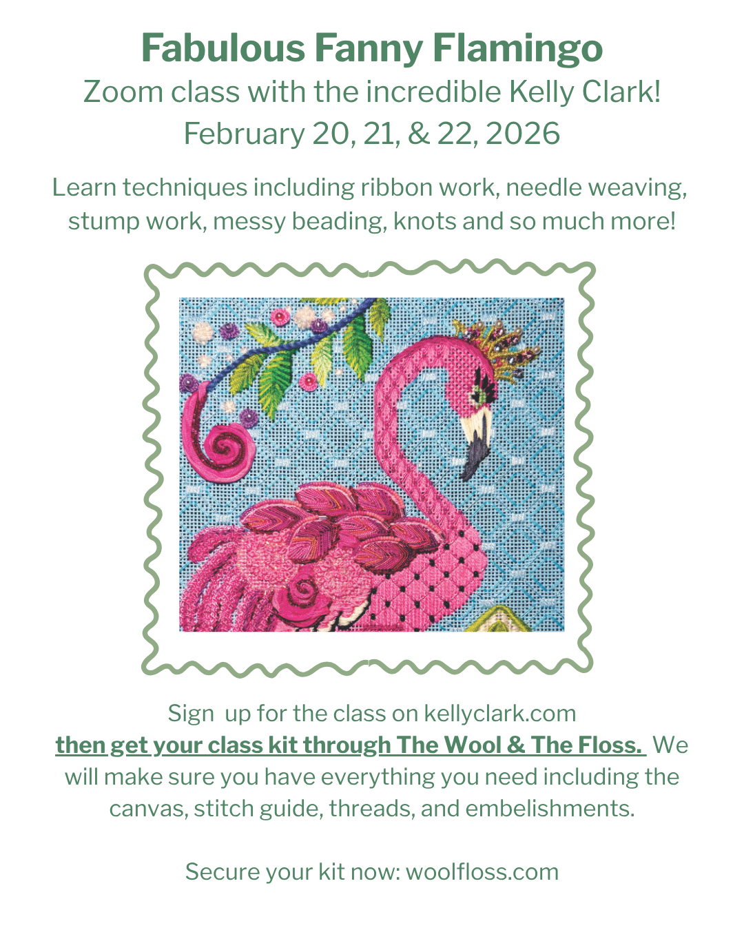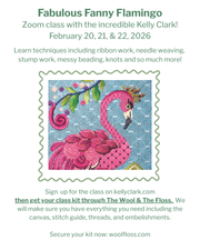 Sign up for the class on kellyclarkstudio.com (this is for the Zoom class only), then get your class kit through us. Class will be recorded!* We will make sure you have everything you need including the canvas, stitch guide, threads, and embellishments. Price shown here is for the canvas and allows us to know how many full kits to order.