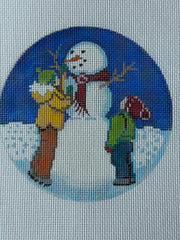 90105 Snowman Building Round , 18 mesh, Handpainted by Patti Mann, Design Size: 4.5" round
