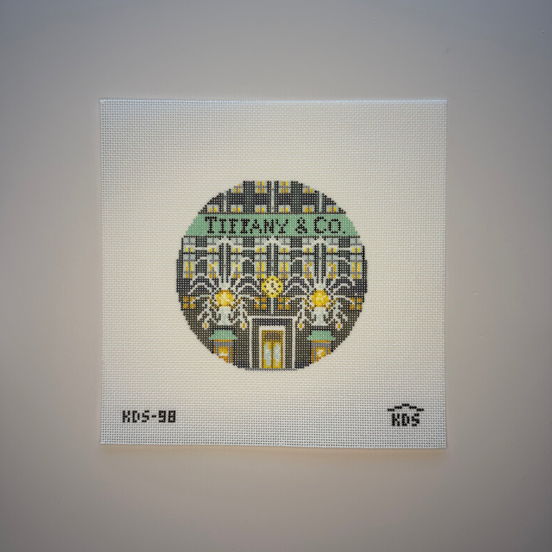 KDS-98 Tiffany & Co Round , 18 mesh, Handpainted by The Gingham Stitchery, Design Size: 4.5" round