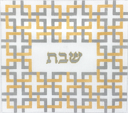 CHAL-03 Interlocking Squares w/ “Shabat” – silver and gold - TS, 13, mesh, Handpainted by Kate Dickerson, Design Size: 15¾ x 13¾ inches